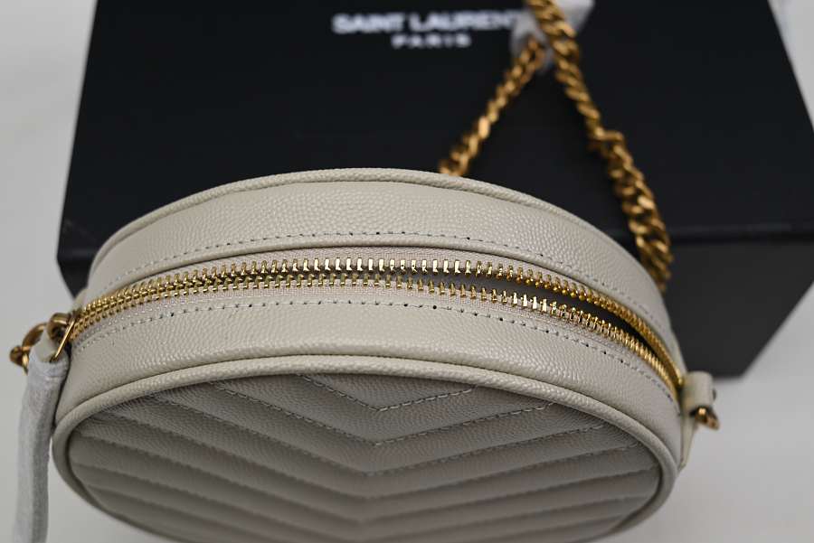 Saint Laurent Vinyle Round Camera Bag Chevron Quilted Grain de Poudre Blanc Vintage